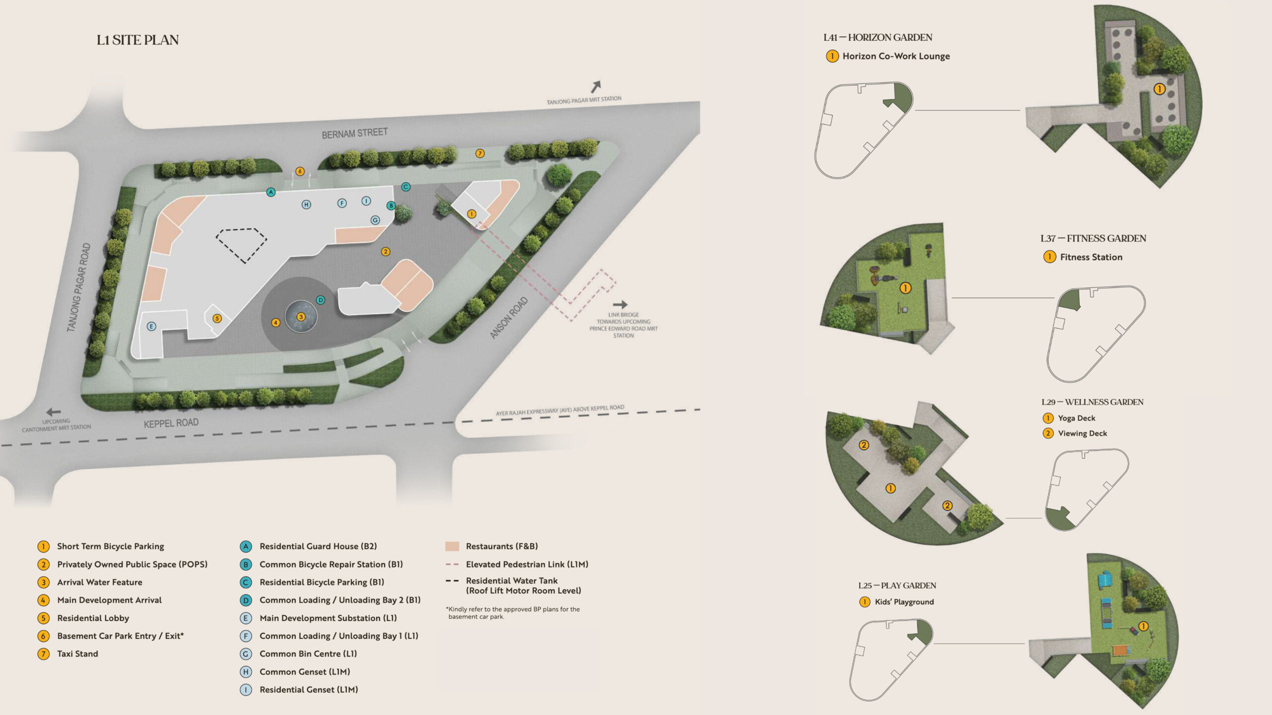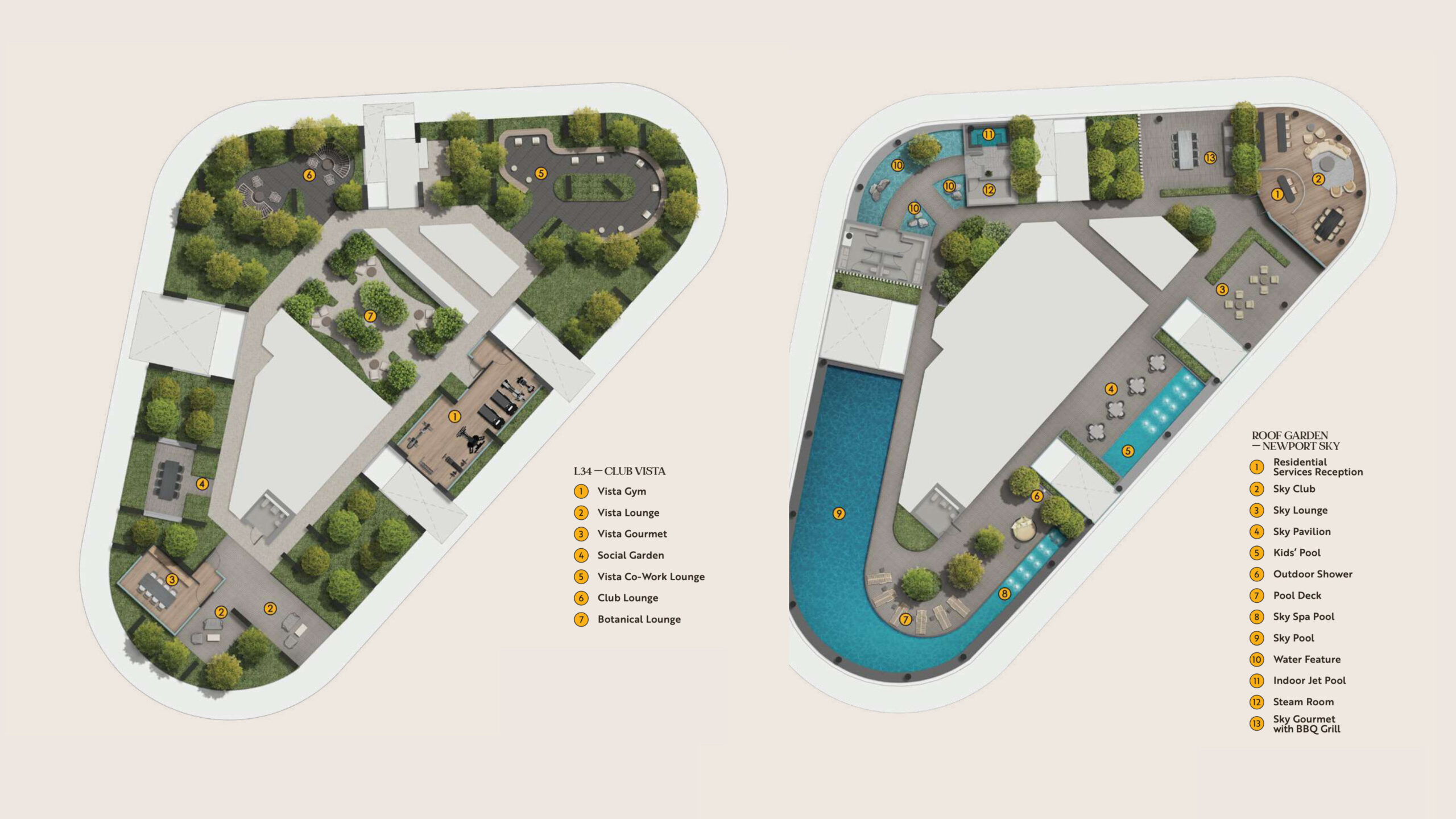 Newport Residences features four lifestyle gardens — Play Garden (Level 25), Wellness Garden (Level 29), Fitness Garden (Level 37) and Horizon Garden (Level 41). Facilities are anchored by Club Vista (Level 34) and Newport Sky at the roof garden, with a sky pool overlooking the city and sea, alongside essentials like a pavilion, landscaped/leisure gardens, car park and 24-hour security.