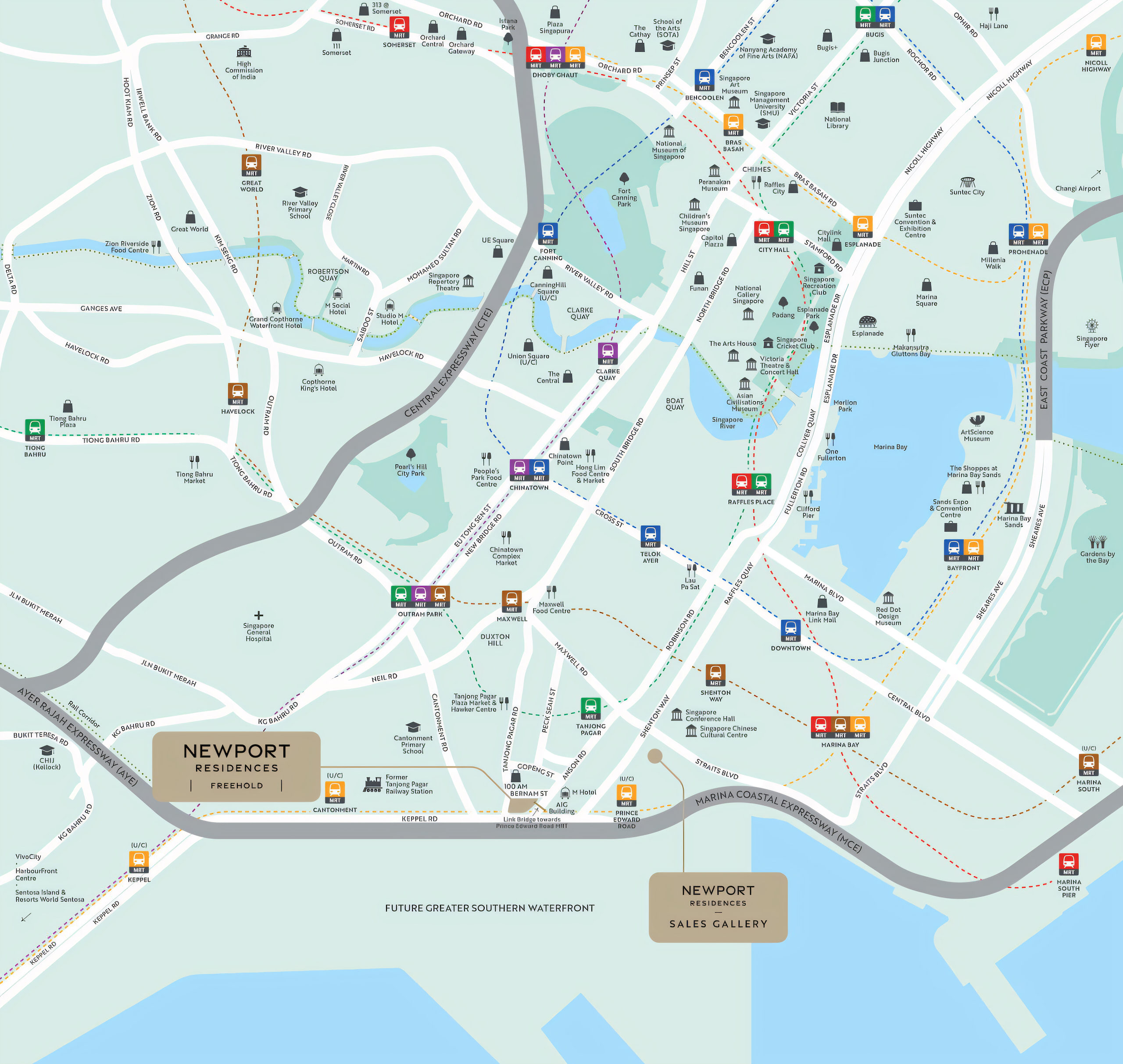 Newport Residences enjoys a prime city address in District 2 along Anson Road, within the Tanjong Pagar and Chinatown precinct. The location places residents near key CBD nodes, heritage streets, dining hotspots, and everyday essentials like supermarkets and clinics. With nearby MRT access and convenient road links via AYE and MCE, commuting across Singapore stays quick and seamless.